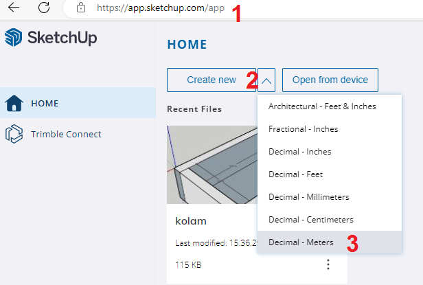 Buka SketchUp dan pilih satuan dalam meter.